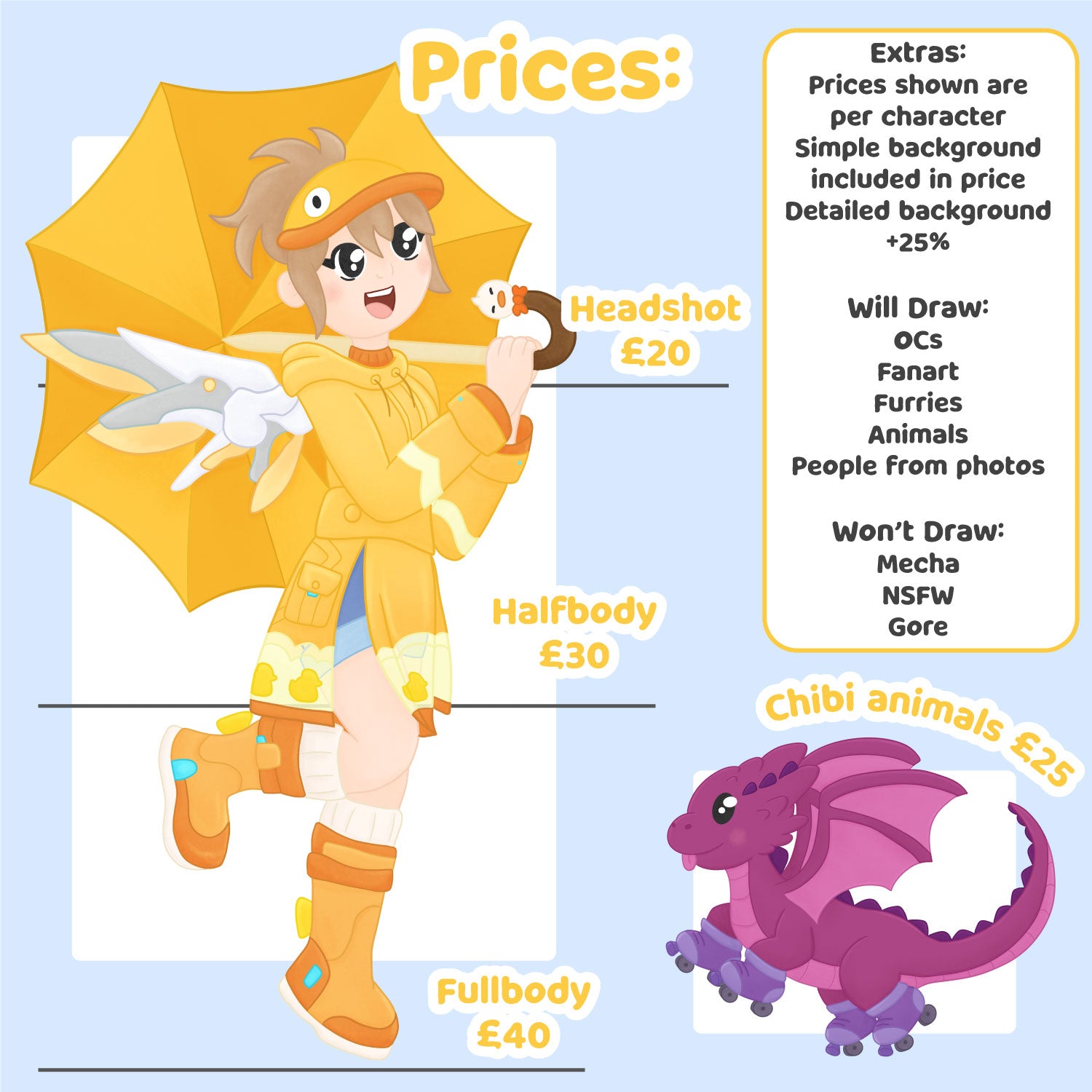 These are all my prices for commissions, if you need any more information or you aren't sure which your commission would fall under drop me a message and I can help you out!