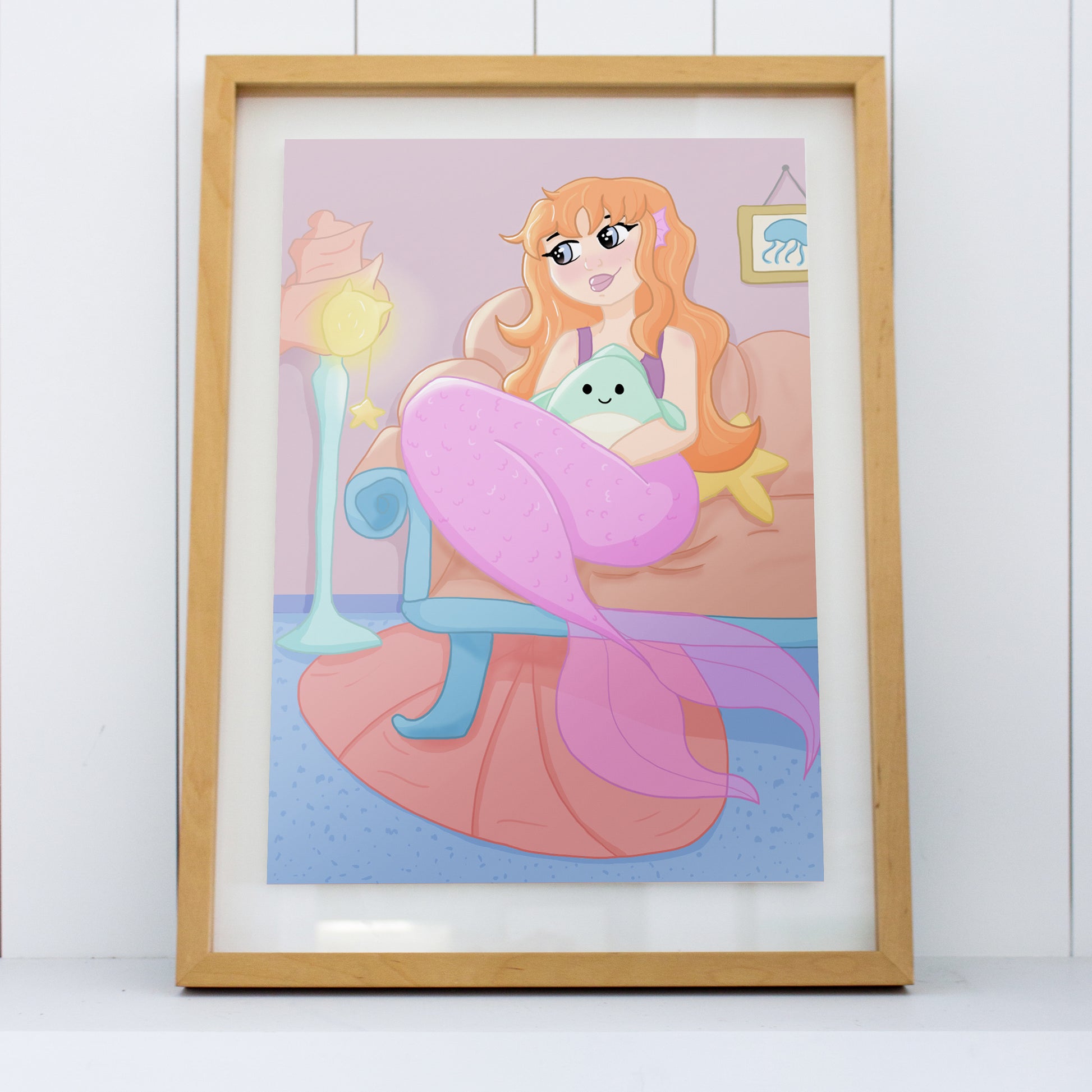 This Cozy Mermaid art print would make a great decoration in anyone's room who loves being the comfiest possible at all times! Plushies, blankets and hot drinks, the full works!